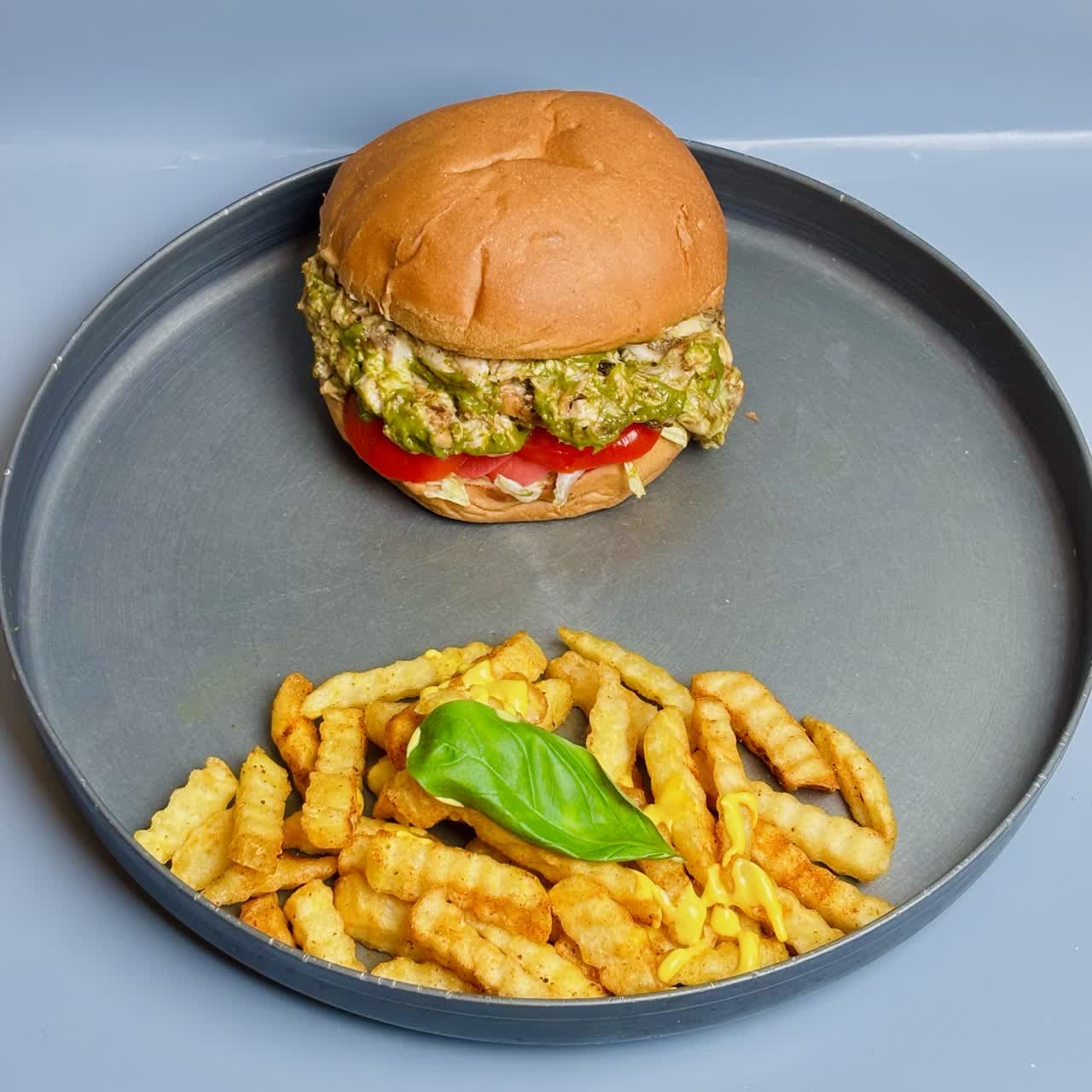 مرغ گریل | سس پستو | پنیر پیتزا |سس پنیر| پیکل تربچه| کاهو | گوجه|Grilled chicken | Pesto sauce | Pizza cheese | Cheese sauce | Pickled radish | Lettuce | Tomato